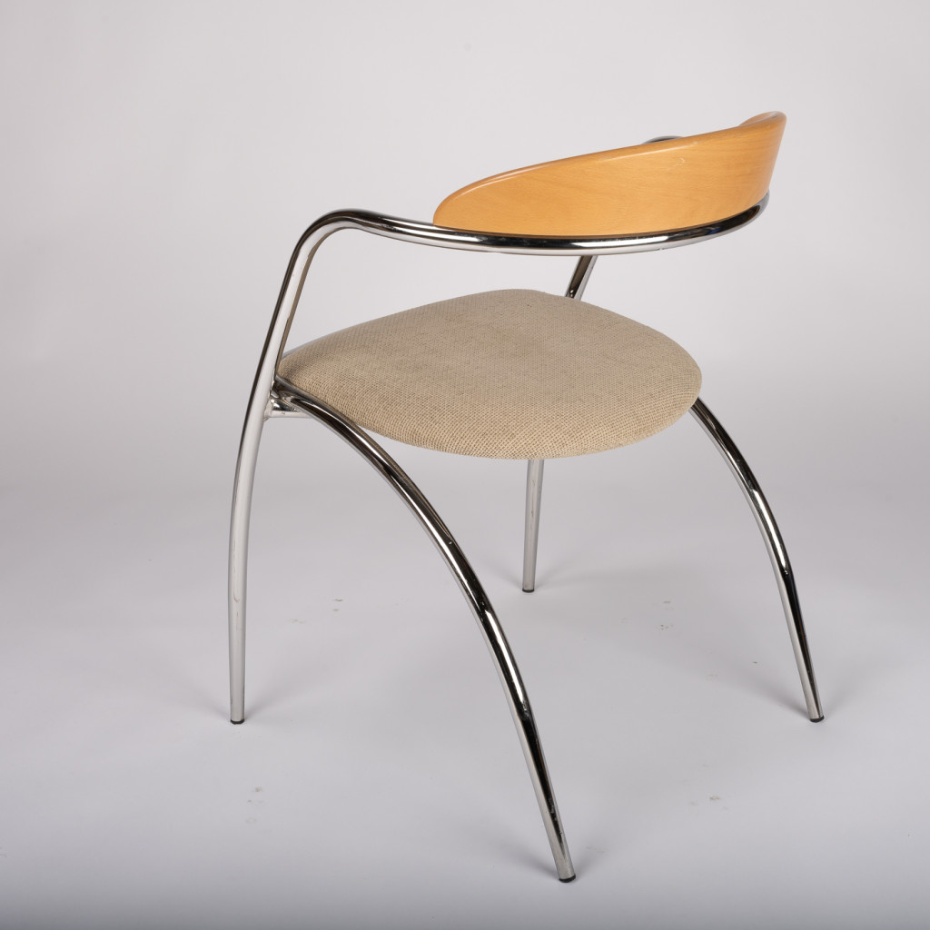 Minimalistická židle vyrobená v 80. letech italskou firmou Effezeta. Židle má prohnutou trubkovou konstrukci z pochromované oceli a úzká dřevěná záda z bukové překližky. Sedák je z měkké béžové látky, ale původní čalounění byla zřejmě černá kůže. Židle jsou stohovatelné a lze je tak úsporně uskladnit.