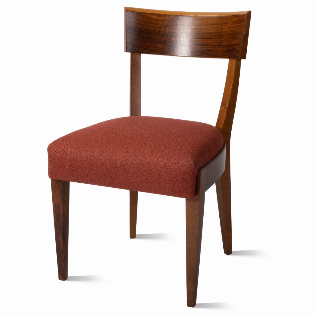 Dřevěná jídelní židle vyrobená ve 40. letech podnikem UP závody podle návrhu Jindřicha Halabaly. Opěradlo je vyrobeno z ořechového masivu, ostatní části jsou z bukového dřeva a potažené ořechovou dýhou. Dřevo má výraznou dřevokresbu a je mořeno do sytě hnědého odstínu. Původní pružinová konstrukce sedáku je nově čalouněna světle červenou látkou. Židle je ve výborném stavu po kompletní renovaci v naší dílně.