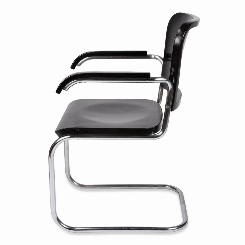 Židle má ohýbanou trubkovou konstrukci z pochromované oceli, která byla důkladně vyčištěna a má pouze drobné oděrky. Dřevěné části jsou vyrobené z kombinace bukového masivu a překližky a mořené do černého odstínu.