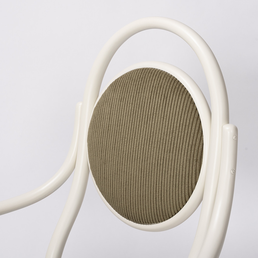 The wooden parts were completely renovated in our workshop and the original seat and backrest were reupholstered in green corduroy fabric.